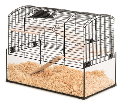 Compleet, stijlvol hamsterverblijf met glazen bodem die bodembedekking beheerst. Inclusief voerbak, loopwiel, huisje, plateaus en trapjes. Afm. 51,5×29×40 cm.